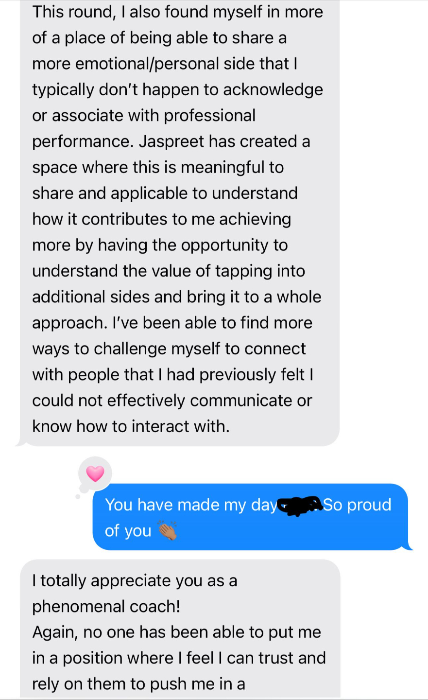 Jaspreet has been exactly the coach to both relate to and challenge me to deeply understand my motivations and hold myself accountable. The Charge Sessions have specifically accelerated my growth by questioning my perceptions and experiences, helping me reframe and take new approaches that push me outside of my comfort zone.