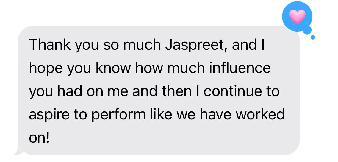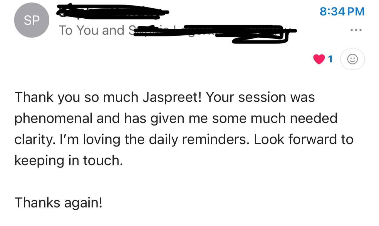 "From our first session, Jaspreet zeroed in on the exact kind of coaching and support I needed. Her insights and wealth of mental tools helped me through an insanely tough period... accelerate towards bigger goals and dreams in a more holistic way."