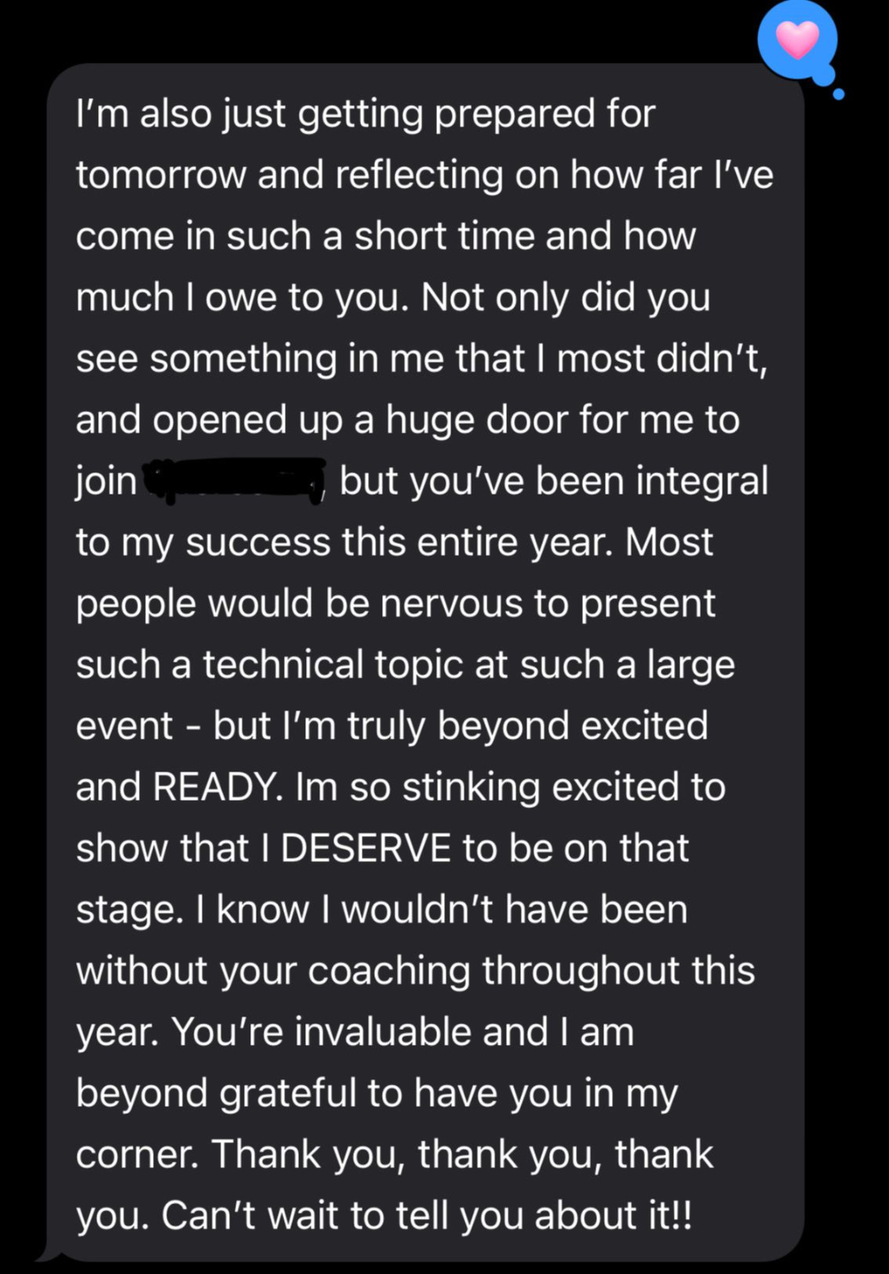 Even in just four sessions, I’ve experienced more clarity, growth, and self-awareness than I ever expected. You have a gift for asking the right questions, gently challenging assumptions, and holding space in a way that feels equal parts safe and energizing. You are truly the embodiment of servant leadership, not just in theory, but in practice. You lead by example with such humility and grace, and it’s honestly one of the most impressive things I’ve had the privilege to witness.
