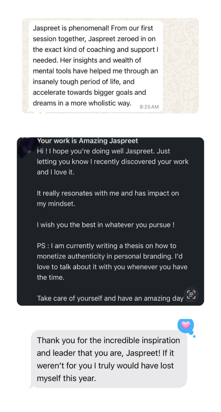 Book A Clarity Call"Jaspreet created a safe and open space, asking insightful questions to truly understand me... She equipped me with practical tools, and I've seen a tangible difference, a powerhouse for anyone looking to elevate their performance."